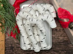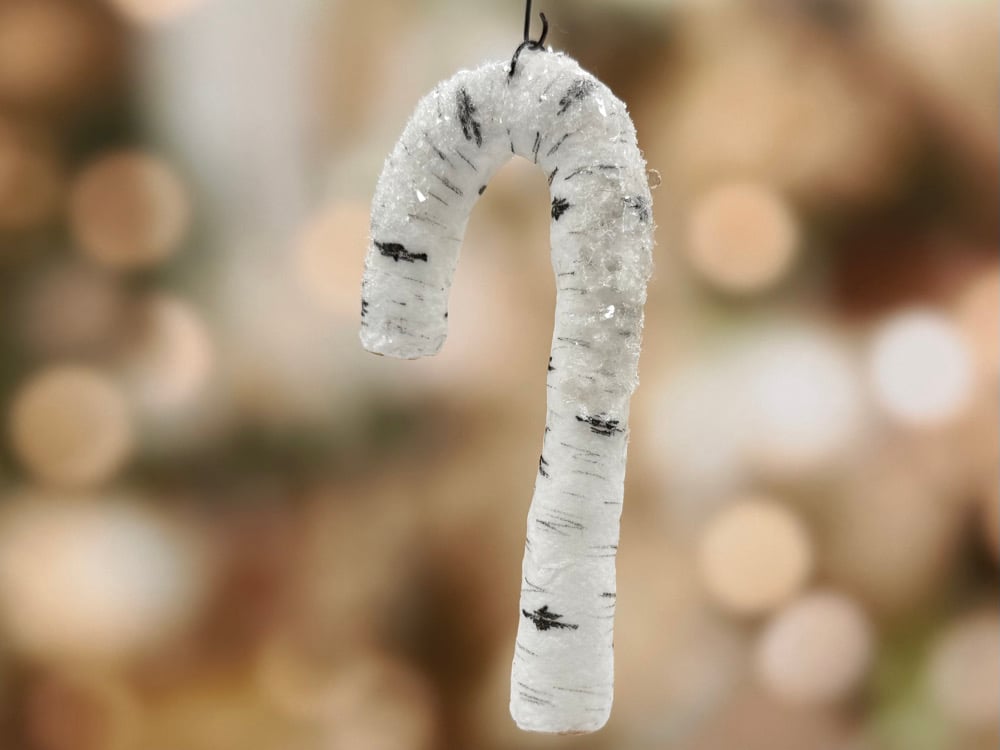 Just like a birch tree, every spun cotton birch candy cane ornament is unique, though they all come with a dusting of snowy glitter on top. Birch candy cane ornaments are generally just over four inches tall. They all come with a wire loop for hanging. Choose your favorite ornament hook, or purchase one here.