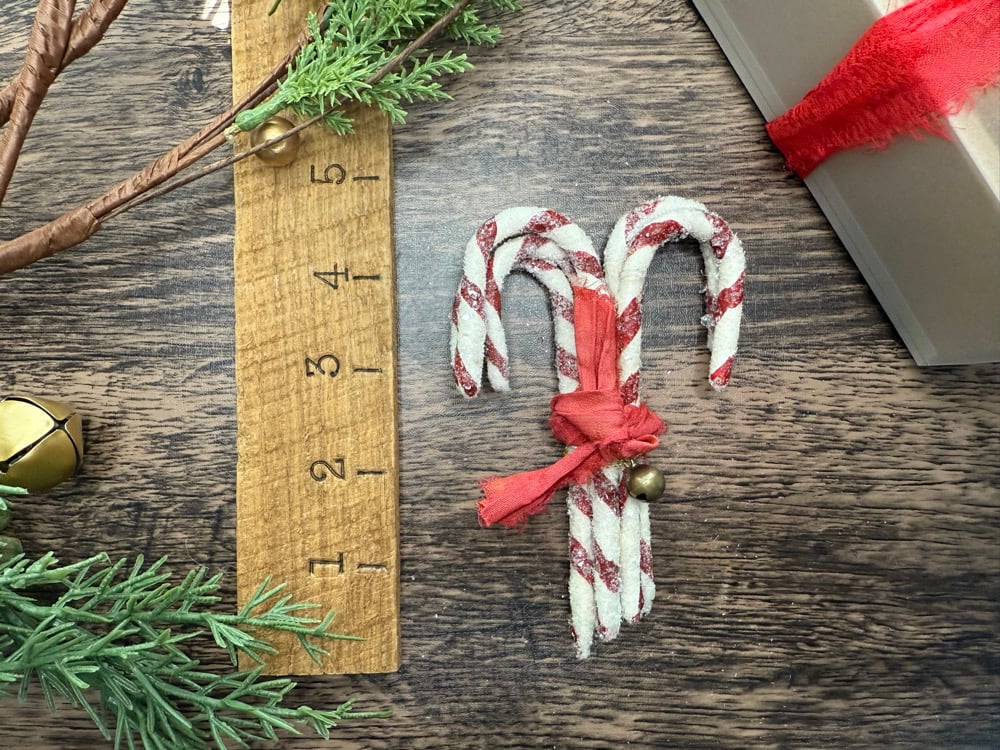 Each Candy Cane ornament is made simply from fluffy cotton batting wrapped around wire and sealed with a paste made of starch and water. They are embellished traditionally, with German glass glitter and mica.