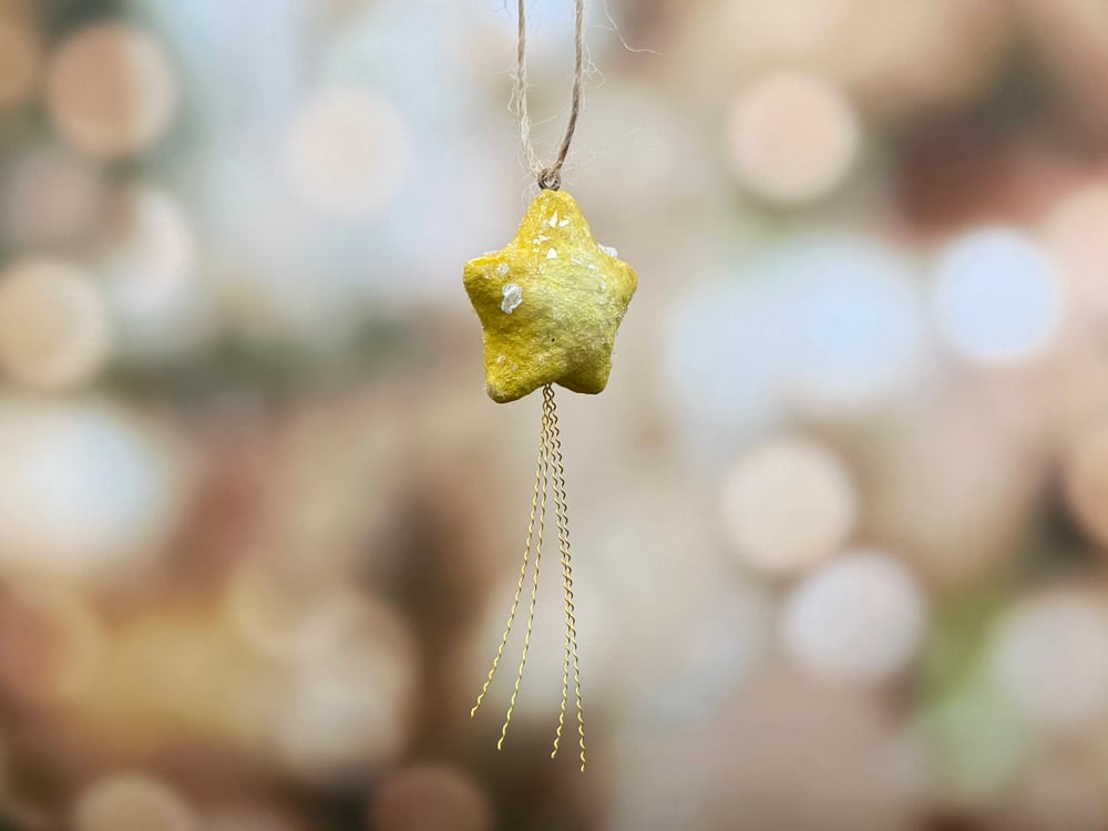 Every spun cotton shooting star is made slowly and carefully by hand, so each one is unique and worthy of wishes. Shooting star ornaments are generally around three inches tall. They all come with a wire loop for hanging. Choose your favorite ornament hook, or purchase one here.